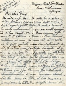 compagnie du peintre Pierre Thévenet et de la femme de ce dernier. Il loge à la Casa Fontana sur le quai des Esclaves. "[...] La vue est admirable. Inutile de te dire que j'ai déjà travaillé et que j'en suis à ma troisième aquarelle. Quelle ville mon vieux !", il poursuit dans sa 2e lettre : "[...] Enfin me voilà à la pension "Bucentoro" où j'ai commencé une toile un peu plus grande que celle de la "Salute". Tu vois que je ne doute de rien. Le temps heureusement, depuis que j'y suis est assez stable, et le tableau avance sérieusement. La vue est superbe ici et ce qui est épatant c'est le passage continuel des bateaux de pèches sous les fenêtres [...] Je continue la visite quotidienne au baromètre pour finir en beauté par les pigeons [...] Ils me grimpent dessus avec une fougue doublée et je dois augmenter sensiblement les provisions que je ne manque pas de mettre en poche avant le départ. Il y en a deux que je prends parfaitement en mains et que je caresse comme je veux à la grande admiration des badauds. Voilà mon vieux où sombre ma mentalité en dehors des heures de travail - et pourquoi pas - St François ne trouvait pas cela si bête [...]". La carte postale fait référence à des problèmes de santé "[...] Ici tout va à la douce et à part un portrait de Madame Bigwood, je n'ai rien fait, quand pourrais-je enfin revivre une vie de travail et de liberté [...]./ Ens. 3 pièces.