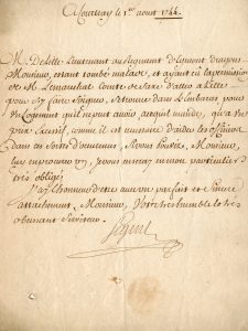 Moreau, Chevalier, Seigneur de Séchelle, Conseiller d'Etat, Intendant en Flandres et des Armées du Roi", surmonté des armes royales. Ces lettres sont, principalement, des réquisitions de logements, de chevaux, de charriots... "pour transporter la poudre", de voitures, de matelas pour les blessés. Une lettre donne la liste des troupes qui marchent en Flandres" et passeront à Lille le 14 septembre 1745. Ces lettres sont écrites de Lille ou "au camp devant Tournay". Intéressant dossier sur des événements de la vie quotidienne pendant la guerre de Succession d'Autriche (1740-1748).