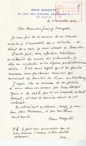 MAGRITTE (René). Lettre autographe, signée, adressée à Jimmy Bourgeois, datée du 15novembre 1963 (papier à en-tête imprimé, 1 p. 8°, cachet). Il s'excuse de ne pouvoir assister à la réunion de Lions, à l'hôtel Westbury. "[...] une...