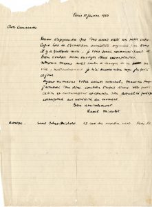 UBAC (Raoul). Lettre autographe, signée "Raoul Michelet", adressée aux "Chers Camarades" [du Groupe Mauvais Temps], datée de Paris, 10 janvier 1936 (1 p. 4°, avec manques marginaux, coupure à un pli). "Venant d'apprendre que vous aviez édité...
