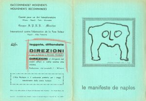 Arte Nucleare.- Le Manifeste de Naples. Napoli, Arti Grafiche Dott. Amodio, 1959, 4 p. 4° tirées sur carton vert (qq. soulignures au crayon rouge et au bic). Manifeste signé par Bruno di Bello, Guido Biasi, Enrico Baj, Recalcati...