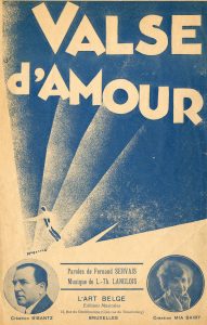 MAGRITTE (René). "Valse d'amour". Partition pour chant illustrée par René Magritte. Paroles de F. Servais. Musique de L. Th. Langlois. Brux., L'Art Belge, 1926, dim. : 27 x 17,5 cm, 4 p. (micro déchirures marg., pet. manque angulaire au dernier...