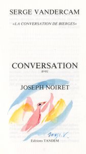 VANDERCAM.- NOIRET (Joseph). Serge Vandercam "La Conversation de Bierges". Gerpinnes, Tandem, "Conversation avec...", 1992, in-12, br., couv. rempliée. Ex. enrichi au titre d'une aquarelle originale signée par Vandercam.