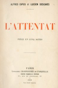 CAPUS (Alfred) et DESCAVES (Lucien). L'Attentat. Pièce en cinq actes représentée pour la première fois au Théâtre de la Gaieté, le 9 mars 1906. P., Librairie Charpentier et Fasquelle, Eugène Fasquelle Éditeur, 1906, 8°, 248 p., demi-chagrin...