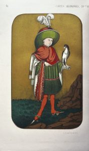 4 ff. n. ch., 144 pp., 2 ff., 73 planches à pleine ou double page, en noir et en couleurs. ÉDITION ORIGINALE rare de cet ouvrage recherché. UN DES RARES EXEMPLAIRES SUR GRAND PAPIER vergé enrichi de 6 PLANCHES EN CHROMOLITHOGRAPHIE que l'on ne trouve que dans ces exemplaires. L'illustration comporte plus de 600 représentations de cartes à jouer en noir, en bistre et en couleurs. Les 73 planches sont numérotées 1 à 74, une note en tête de l'album précise que la n° 58 manque en raison d'une erreur de foliotation. Exemplaire de présent avec un envoi signé de l'auteur à "Son excellence M. le Ministre des Beaux-Arts" [Jean-Baptiste Philibert Vaillant].