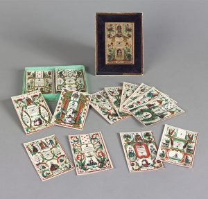 Belle boîte à quadrille recouverte de papier polychrome verni. Décor floral de style vénitien en Arte povera, couvercle bombé, crochets fermoirs en laiton. La boîte contient 4 petites boîtes en bois également bombées et recouvertes de motifs polychromes. Sur chaque boîte est monté un cadran en os peint portant en son centre une couleur de carte, le cadran pivote pour afficher des numéros de I à X. Chaque boîte contient 15 fiches en os.