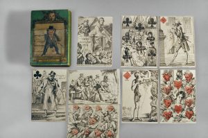 Un des plus célèbres "jeux à transformations" français. Il comporte 32 cartes à l'eau-forte, certaines coloriées, une carte frontispice ainsi qu'une carte d'introduction qui présente le jeu. Ces jeux satiriques illustrés de caricatures viennent des pays germanophones et particulièrement d'Autriche. Ils connurent une certaine vogue en France sous la Restauration. "C'est très probablement un des premiers jeux de ce genre fabriqués en France. Le frontispice représente une parade dans un théâtre forain. Le roi de coeur est l'Amour, et la reine la Volupté ; pour les trèfles nous trouvons Bacchus..." dit D'Allemagne Cartes, I p. 266-267 qui reproduit ce jeu sur 2 planches à pleine page d'après l'exemplaire défraîchi de la collection Marteau. La BNF, qui possède la maquette dessinée de ce jeu, révèle qu'il a été conçu par A. G. Houbigant et dessiné par N. T. Charlet et J. L. H. Bellangé. Aucun exemplaire décrit ne semble complet, frais et préservé dans sa boîte d'origine comme c'est le cas ici.