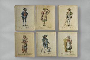 Beau jeu romantique de 26 cartes sur vergé enluminées à l'aquarelle représentant les métiers de la campagne. Encadrement d'un filet noir, légendes en allemand et en français. Étui défraîchi.