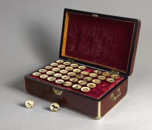 Jeu fort ancien d'origine italienne, le jeu du coucou s'est diffusé dans toute l'Europe. Sa présence est attestée en France dès le XVIe siècle par un passage de Rabelais. Habituellement sous forme de cartes, les exemplaires sous forme de jetons, quoique documentés, notamment à Venise, semblent rarissimes. # Le jeu est formé de 38 jetons en bois tourné de 4 cm. de diamètre et de 5 cm. de haut. La face de chaque jeton est peinte, le jeu est formé de 19 paires : 10 paires de chiffres et 9 paires de figures. Le jeu comporte de plus un sac en soie muni d'une cordelette et d'anneaux en os. # Le tout est soigneusement préservé dans un luxueux coffre de fabrication postérieure (seconde moitié du XIXe) en acajou et laiton doublé de velours. Dans le fond de la boîte on trouve des documents en néerlandais au sujet de ce jeu ; une lettre manuscrites d'1 p. in-4, une autre lettre de 4 pp. in-12 indiquant les règles du jeu et 2 versions tapuscrites de ces règles. La boîte contient aussi une pochette en feutre portant une étiquette brodée de la maison d'orfèvrerie Bonebakker & zoon. # Au sujet du jeu de coucou et son histoire, voir Franco Pratesi, Cards and men for cucù, The Playing-Cards Vol. XIX, pp. 68-76 (visible sur son site). Pour l'attribution probablement vénitienne et pour leurs informations au sujet de ce jeu, nous adressons nos remerciements aux historiens du jeu Luigi Ciompi, Adrian Seville et Thierry Depaulis qui nous ont aimablement fait bénéficier de leurs connaissances.