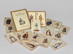 Jeu de cartes se rapprochant de l'écarté composé de 3 séries de 8 cartes. Les personnages ; la paysanne, jeune villageois, ménestrel, la médisante, dame de cour, la duchesse, la rosière, etc. sont finement gravés et coloriés offrant une belle galerie de costumes. 1 feuille in-12 donne les règles et la liste des cartes et points. Très bel exemplaire frais.