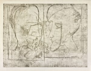 Belle épreuve, l'une des 6 ou 10 tirées sur japon avant le tirage ordinaire à 50 exemplaires. Gravure sur vernis mou réalisée d'après le tableau de 1911 Les joueurs d'échecs où M. Duchamp a représenté ses deux frères, Jacques Villon et Raymond Duchamp-Villon, disputant une partie. Cette planche fut réalisée par Duchamp au profit de la Marcel Duchamp Fund au sein de la American Chess Foundation, à l'occasion de l'exposition « Hommage à Caissa » en 1966. # A. Schwartz, The Complete Works of Marcel Duchamp n°621a. – Marge supérieure légèrement endommagée, en partie doublée.