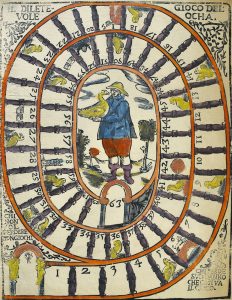 Il Diletevole Gioco del Ocha. s.l. [Italie], [XVIIIe siècle]. Xylographie coloriée de 46 x 34 cm.