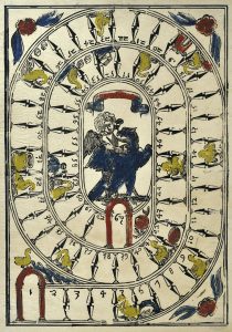 IL GIOCO DELL’OCA. Xylographie coloriée, imprimée sur vergé, 29 x 41 cm. (XVIIIe siècle).