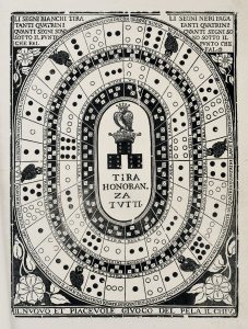 Jeu composé de deux séries de cases disposées en 2 ovales concentriques, les coins ornés de motifs floraux. Les cases montrent des combinaisons de dés et le nombre de jetons correspondants ou des chouettes couronnées. Sorte de loto dont les cases portent la mention "tira" ou "paga". Le centre du plateau est occupé par une chouette couronnée surmontant trois dés et la mention "Tria honoranza Tutti". Les règles du jeu sont dans les angles supérieurs, le nom du jeu au bas de la planche. Il signifie "plumer la chouette". Le jeu consiste à jeter trois dés dont la combinaison indique une case contenant des instructions et points. Bertarelli, L’imagerie populaire italienne, p. 61 – Très bel exemplaire très frais à toutes marges.