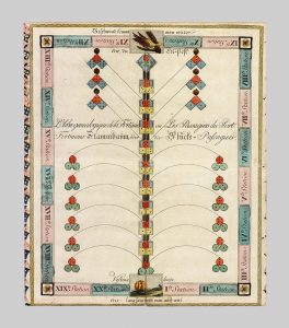L'arbre généalogique de la Fortune, ou Les Passagier du Port – Fortunens Stambaum oder die Glück-Passagiers. s.l., [seconde moitié du XVIIIe siècle]. Taille-douce de 33 x 40,5 cm. coloriée à l'aquarelle montée sur cartonnage pliant, dos...