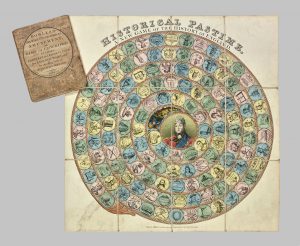 Belle plaque gravée sur bois de fil pour Jeu de l'Oie renouvelé des grecs... paru chez Pellerin au début du XIXe. Le bois est de forme rectangulaire, le jeu est de forme ovale avec des ornements floraux aux angles. La case 63 représente une oie. Un espace de forme ovale est réservé au centre du jeu pour le titre et les règles en caractères d'imprimerie. On trouve à la même époque des planches presque identiques chez les maisons parisiennes Basset et Picard. Les tirages que l'on rencontre de ce jeu sont tous sur beau papier vergé et coloriés. Le bois s'est fendu sur toute sa longueur sans perte de matière, il a été réparé anciennement par un parquetage au dos. Trous de vers.