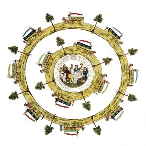 Jeu de forme circulaire. 12 omnibus tirés par des chevaux sont représentés sur 2 cercles concentriques. Au centre, dans un médaillon, des joueurs attablés encadrés des règles avec un titre différent Nouveau jeu des omnibus... Ce jeu est un exemple précoce de jeu publicitaire, pour l'Entreprise Générale des Omnibus à 25 c. Mais c'est grâce à une autre marque qu'il accède à la célébrité. Cette estampe a en effet été choisie par la maison Hermès en 1937 pour illustrer le premier de ses fameux carrés de soie.