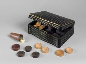 Jeu de 32 jetons allemand du XVIIIe siècles en bois tourné et gravé. Chaque pièce est gravée sur les 2 faces et sertie dans un anneau en buis tourné. Chaque jeton mesure 5 cm de diamètre. Les sujets représentés sont des portraits de personnalités de l'époque : Frédéric de Prusse, Stanislas, Auguste III de Pologne, etc. des vues de villes : Munich, Nuremberg, Hambourg ou des devises illustrées de scènes allégoriques à la manière des livres d'emblèmes. # Le jeu est conservé dans un très luxueux coffret compartimentée en ébène (30 x 22 x 12 cm.) La façade de la boîte est galbée, les faces sont encadrées de filets de laiton et parsemées d'un semis de rosaces en laiton. Boîte signée Tahan sur une plaque en laiton gravée. Jean-Pierre Tahan (1813-1892) qui possédait un atelier rue de Paix était l'ébéniste de Napoléon III. Cette boîte contient en outre 2 gobelets en cuir et un dé en ivoire. Joint : 3 autres jetons de backgammon allemands de la même époque, de même format, également gravés mais n'appartenant pas à cette série.