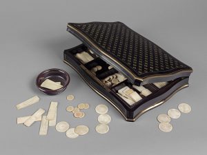 Superbe boîte en ébène de style Napoléon III de la célèbre maison parisienne Vervelle-Audot. (33 x 24 x 6 cm.) Les faces sont galbées et encadrées de filets en laiton, le couvercle est parsemé d'un semis de rosaces. L'intérieur se compose de 8 compartiments mobiles contenant environ 300 jetons et fiches en os de divers formats et une coupelle en bois tourné.