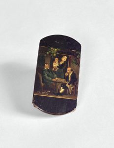 Superbe étui à cartes en laque du XIXe. 13,5 x 7 cm. Les deux faces sont légèrement bombées, l'une portant une peinture représentant des joueurs de dames. Les soufflets de l'étui sont en cuir et un second étui en cuir de Russie s'insère dans le premier. Légères craquelures à la laque. Très bel objet.