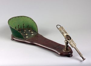 Version de salon du lancer d'anneaux, ce jeu est constitué d'un plateau en chêne de 63 cm. en forme de raquette monté sur 3 pieds. À une extrémité se trouvent des crochets numérotés. Une protection en tôle peinte doublée de feutre entoure le dispositif pour éviter de projeter l'anneau hors du jeu. À l'autre extrémité du plateau se trouve un lanceur orientable muni d'une tirette à ressort comme celles des jeux de bagatelle et du flipper. Exemplaire en parfait état de fonctionnement.