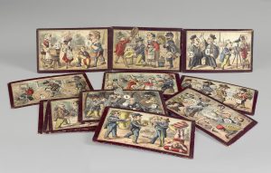 Jeu de loto comique dont les numéros sont masqués par des parties mobiles de la scène (membres des personnages, roues, etc.) montées sur rivets. La maison Mauclair et Dacier a publié plusieurs séries de cartes de ces lotos animés. Cette suite comporte Cycliste trop pressé – Discussion musicale – La grande parade – Transformation instantanée, etc. Série bien complète, sans sa boîte d'origine.