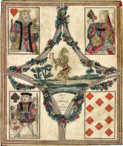 Rare jeu de Nain jaune parisien du cartier G. Mandrou. Au centre "est un personnage revêtu du costume de la Folie, agitant d'une main un hochet, tandis que de l'autre il présente le bienheureux sept de carreaux" dit D'Allemangne, Cartes I, p. 288 qui reproduit ce jeu à pleine page. Marques de poussière et petites fentes dans les marges.