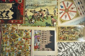 64 planches, la plupart de 35-45 cm. x 40-55 cm. certaines de plus petit format. La plupart en couleurs, souvent sur papier glacé. Ces planches sont des plateaux de jeu, des jeux de construction à découper, ou encore des illustrations pour les couvercles des boîtes. Parmi les jeux : Le cheval blanc, Les ombres chinoises, Jeux de l'oie, Échelles et serpents, Cartes géographiques, Course automobile, Touriste, Aéroplane, etc. # Joint : une enveloppe contenant les règles imprimées de divers formats de plusieurs de ces jeux : Saut des Barrières par le célèbre Polichinelle – La guerre de l'avenir – Ali Baba et les 40 voleurs – La cigogne et la grenouille – Jeu du tobogan – Teuf Teuf – La colonie de vacances. La plupart en nombreux exemplaires.