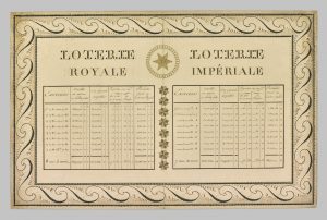 Beau placard très frais. L'article XI, qui se rapporte au droit des femmes qui auront pris des actions de la loterie avec l'accord de leurs maris à jouir à vie des rentes qui leur seront échues par la loterie, a été modifié au moyen d'une bande de papier imprimée et collée par dessus l'ancien article. Note et signatures de l'époque au bas de la feuille (Sablon, Jouy, Martine).