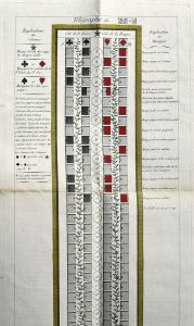 43 pp., 1 planche dépliante. ÉDITION ORIGINALE très rare. L'auteur expose les règles de dénombrement et les calculs de probabilités qui s'appliquent à ce jeu. Nombreux tableaux in-texte et une planche dépliante gravée par Gaitte aquarellée. Manque aux bibliographies et collections spécialisées tant ludiques que mathématiques. Angle du titre sali.