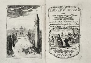 Frontispice et titre gravé, puis 61 pp. et 12 planches gravées sur 6 ff. Rare édition du traité d'Indovino. Cette version permet de gagner à la loterie vénitienne grâce à l'interprétation des songes. Un second titre imprimé dit Lista generale dell' anonimo cabalista ricavata dal libro autentico stampato l'anno 1733 in cui si conserva estesa par ordine di alfabetto con nuova Aggiunta di molte Voci, stampate con l'istesso mettodo per diletto delli Gioccatori del Pubblico Lotto di Venezia... L'ouvrage est orné d'un beau frontispice représentant la place S. Marc et d'un titre gravé dans un encadrement de rinceaux, montrant les Vénitiens récompensés par la providence. Les 12 planches à la fin de l'ouvrage donnent 2 versions des 90 vignettes permettant d'associer un objet rêvé à un numéro. La première série occupe 10 planches, chacune portant 9 sujets légendés ; la seconde série, sur les 2 dernières planches, est constituée de vignettes muettes de petit format. De la bibliothèque de Giannalisa Feltrinelli (ex-libris gravé et timbre sec), épouse du plus grand financier italien de sont temps, Carlo Feltrinelli (1881-1935). Bel exemplaire dans son cartonnage d'attente.