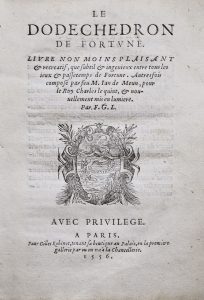 MEUNG (Jean de) – [GRUGET (François)]. Le Dodechedron de fortune. Livre non moins plaisant & recreatif, que subtil & ingénieux entre tous les ieux & passetemps de Fortune. Autrefois composé par feu M. Ian de Meun, pour le Roy Charles le quint, &...