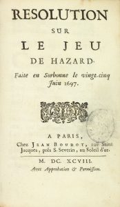 Résolution sur le jeu de hazard faite en Sorbonne le vingt-cinq juin 1697. Paris, J. Boudot [Antoine Lambin], 1698. In-12 basane brune, dos à nerfs orné. (Reliure de l'époque).