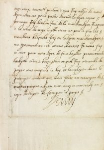 Précieux document qui témoigne de la passion pour le jeu du roi de France. Au verso une note dit "Le roy du dernier febvrier 1607 pour bailler 9000tt au sr Berhinghen pour jouer – A son cousyn le duc de Sully". # Henri IV demande à Sully de faire parvenir 3000 écus à Beringhen afin d'honorer ses dettes de jeu contractées durant la foire Saint-Germain. Pierre de Beringhen qui était le premier valet de chambre et homme de confiance du roi était chargé de rembourser ces sommes aux débiteurs "pour ce que les marchans desquels jay eu la dyte marchandyse me tyennent au cul et aus chausses". Cette formule assez triviale et la circonstance dans laquelle elle a été écrite est rapportée par Sully dans un passage de ses Mémoires où il parle de la passion du roi pour le jeu. Passage où il donne quelques détails sur la marchandise laissée en gage : "J'ai tenu note de plusieurs sommes considérables perdues au jeu par Henri. Je ne les marquerai pas toutes (...) En 1607, il me fit demander par Beringhen neuf mille livres qu'il avoit perdues à la foire Saint-Germain, en bijoux & bagatelles : il m'écrivoit que que les marchands le tenoient au cul et aux chausses pour cette somme (...)" cité dans Dict. des jeux, P., Panckoucke. 1792 p. 124 (lot 42). # Les lettres autographes d'Henri IV sont rares. Celle-ci, rapportée par son ministre économe constitue la principale source historique de sa fameuse réputation de joueur. Elle offre de plus un témoignage particulièrement touchant de sa simplicité de mœurs. Une marge doublée.