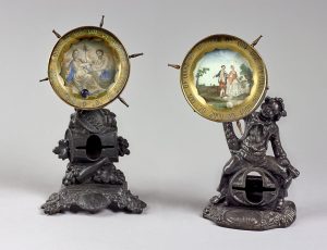 Deux roulettes de comptoir munies de socles en fonte, roues en laiton vitrée, chiffres gravés, le fond des cadrans est illustré d'une planche lithographiée en couleurs. Une bille roulant dans le cadran indique les gains. # 1 – L'une montrant une scène antique avec la mention "Au petit homme gris SAMSON frères – articles de limonadiers" # 2 – L'autre montre une scène galante. # Lot divisible au gré des acquéreurs.