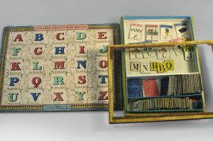 Alphabet Patience et Joujou. [Paris, Amonier], [1836]. Jeu dans une boîte de 3 x 23 x 16 cm. en cartonnage orné de papier dominoté, couvercle en verre soufflé.