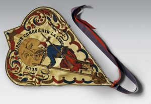CERF-VOLANT. Épinal, Pellerin, vers 1860. 69 x 48 cm. Beau cerf-volant imprimé sur tissu Nous irons conquérir la lune, angles arrondis avec baleines, queue en rubans. Quelques taches.