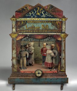 LUSTIGER BALL. Théâtre mécanique en bois et tôle. (XIXe siècle). 47 x 30 x 76 cm.