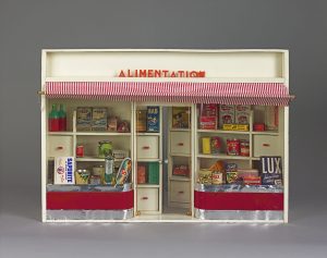 Magasin d'alimentation miniature constitué de rayonnages et tiroirs protégés par une vitrine et deux portes en plexiglass. La boutique est surmontée d'un store en tissus. Les rayonnages sont entièrement garnis de produits de l'époque en version miniature : Olida, Buitoni, Ajax, Persil, Lux, Alsa, Francorusse, etc.