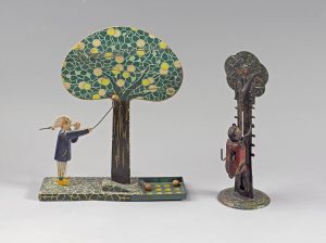 JOUET MÉCANIQUE. Singe montant à un arbre. Jouet en tôle peinte. (vers 1900). h. 37 cm. En état de fonctionnement, verrouillage du ressort défaillant.
