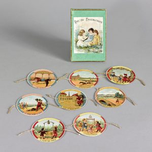 [CINÉMA]. Jeu du Thaumatrope. Paris, M. D., Académie de Arts Graphiques, vers 1890. 8 thaumatropes de 7,5 cm. de diametre dans une boîte en cartonnage illustrée en chromolithographie de 10 x 16,5 cm.