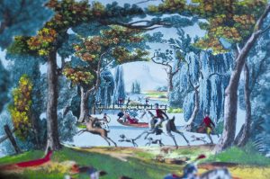 Paysage sur 5 planches lithographiques en couleurs, ajourées en leur centre et reliées entre elles par un accordéon de papier. L'objet se déploie sur une hauteur de 67 cm., une lumière percée dans le premier carton permet de regarder tous les cartons à la fois, formant ainsi une scène en relief, elle représente un paysage d'arbres, pont, promeneurs et et cavaliers. Le premier carton est illustré d'une scène de lanterne magique. Le jeu est préservé dans un étui en cartonnage rose, étiquette.