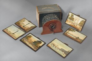 Ce jeu optique inventé par l'opticien parisien Lemaire est composé d'une chambre en bois recouverte de papier, d'une lentille montée sur un cadre en bois relié à la chambre par un soufflet de mise au point. Des images sont glissées dans le fond de la boîte, un système de volets au dessus et à l'arrière de la chambre permettent d'orienter l'éclairage, soit sur l'avant de l'image, soit par derrière. # Petit modèle de polyorama dont la chambre noire mesure 16 x 10,7 cm. Il comporte 6 vues de Paris de 14 x 9 cm. montées sur châssis et munies de petites perforations aux réverbères, fenêtres, etc. donnant autant de points lumineux lorsque l'éclairage passe de l'avant de scène (vue de jour), vers l'arrière de la planche pour montrer la même scène de nuit. Exemplaire en état de fonctionnement, légère usure et petits accidents au soufflet et à 1 planche.