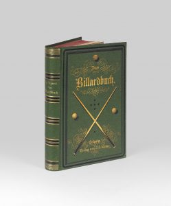 BOGUMIL (Cz.). Das Billardbuch. Vollständige Theorie und Praxis des Billardspiels. Mit 128 in den Text gedruckten Illustrationen. Leipzig, Weber, 1895. In-8 cartonnage toile verte à décor noir et or, tranches rouges (cartonnage d'éditeur).