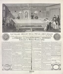 Collection complète des trois affiches publicitaires de la maison Charles Chéreau, fabricant de billards à Paris bd. Saint-Martin. Ces affiches étaient proposées à la vente au prix de 6 fr. l'unité et 10 fr. les trois. # 1) Nouvelles règles de la poule à deux billes. Rédigées d'après les avis des plus forts joueurs principalement des sieurs Ch***, N***, M*** & publiées par Guilélouvette & Thomeret fabricants de billards brevetés du Roi. 1830 Beau placard entièrement gravé et dessiné par Daniel. Le tiers supérieur porte une gravure représentant des joueurs autour d'un monumental "Billard à musique exposition du Louvre 1827 par Charles Chéreau". Le reste de la composition porte les règles du jeu sur 6 colonnes. Divers ornements gravés, médaillons et cachet estampillé de la maison Chéreau à un angle. # 2) Nouvelles règles du jeu de Billard rédigées d'après les avis des plus forts joueurs principalement des sieurs Ch***, N***, M*** , et publiées par P. Charles Chéreau fabricant de billards, breveté du Roi. Sans date, vers 1830. Il s'agit du dernier des 3 placards publiés par Chéreau. Entièrement gravé, règles sur 6 colonnes, ornements représentant des queues et tables de billard et médaillons dans les angles, ornements maçonniques dans le texte. Cette affiche donne les variantes possibles sur la partie ordinaire : Doublet franc, blanche, blanche au doublet, russe, des cinq blouses, etc. # 3) Nouvelles règles du jeu de Billard rédigées d'après les avis des plus forts joueurs principalement des sieurs Ch***, N***, M*** , et publiées par P. Charles Chéreau fabricant de billards, breveté du Roi. Sans date (v. 1830). Même composition que le placard précédent avec des ornements différents. Cette affiche donne sur 6 colonnes en 58 articles, les règles de la partie ordinaire. # - D'Allemagne Sports p. 275-76 reproduit le n° 1 et donne une description du billard à musique – Catal. Rodolphe Chamonal Jeux & Sport noir n°258 pour le n° 3 et catal blanc163bis pour le 2. # Joint : manuscrit de l'époque sur 4 pp. in-12 donnant les "Règles du jeu de Guilbert au Billard" avec un croquis indiquant la disposition des quilles sur le billard.