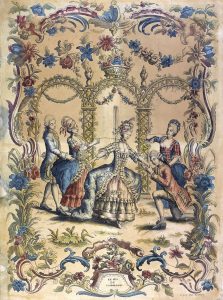 Superbe planche soigneusement coloriée montrant un groupe de jeunes gens jouant à colin-maillard dans un riche encadrement baroque de fleurs et rocailles. Papier entièrement jauni, 2 mouillures à la marge gauche, petites fentes sans manque.