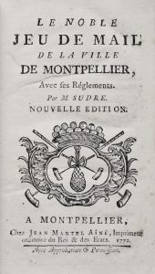 4 ff. n. ch., XVI pp., 45 (1) pp., 2 ff. de table, une planche dépliante et illustr. in-t. Ouvrage rarissime. Bien que le titre porte la mention de "nouvelle édition", on n'en connaît aucune antérieure. Le titre est orné d'un médaillon emblématique avec maillets et balles. La planche dépliante est un gabarit donnant "le poids de la boule jusques à 16 onces poids de marc". Les planches in-texte montrent des figures de jeu et un Plan pour le tirage du Globe. Quérard IX p. 283 ne connaît que l'édition de 1822. Pas dans Conlon ni dans Cioranesco. Le jeu du mail, un sport très populaire en France et en Italie au Moyen Âge a connu son apogée au XVIIe siècle lorsqu'il fut adopté par les Anglais sous le nom de Pall-Mall. C'est l'ancêtre des jeux de balle et maillet tels que le golf, le croquet, le polo, le base-ball et même le billard. Bel exemplaire en cartonnage de l'époque, le seul autre exemplaire localisé est celui de la BNF.
