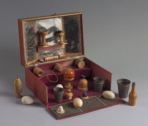 Belle boîte contenant divers objets et boîtes de formes diverses en bois tourné, l'une contenant 4 bâtons de couleurs, trois gobelets en fer blanc, 4 œufs en plastique et une lame en acier. La boîte s'ouvre pour devenir un présentoir couvert de papier décoratif et de miroirs.