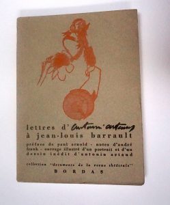 Artaud (Antonin). « Lettres d’Antonin Artaud à J. L Barrault ». Bordas,1952, in-12 broché, couverture rempliée d'édition illustrée d'un dessin d'A. Artaud. 182 pages. Portrait d'Artaud en frontispice. Un dessin d'Artaud en noir hors texte et...