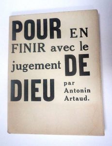 Artaud (Antonin). « Pour en finir avec le jugement de Dieu ». K éditeur,1948, in-16 broché, couverture souple d'édition. Infimes traces au second plat. Bon exemplaire en partie non coupé.